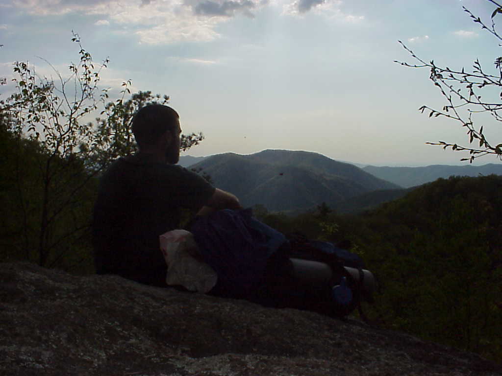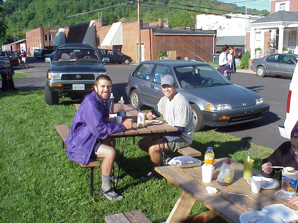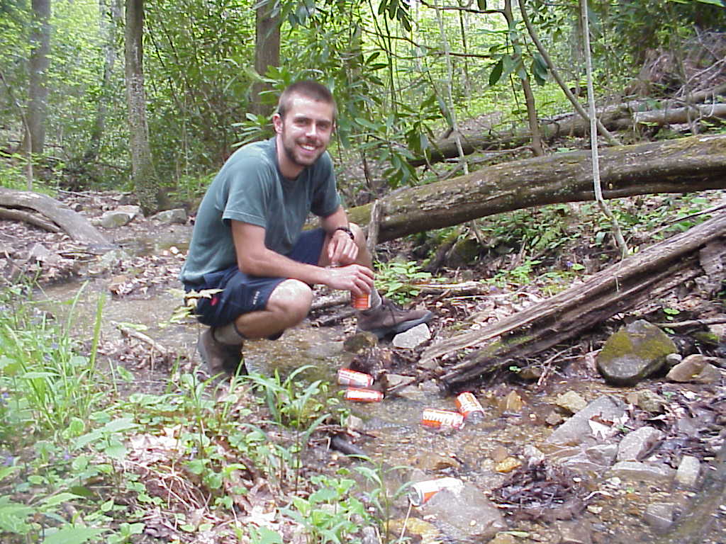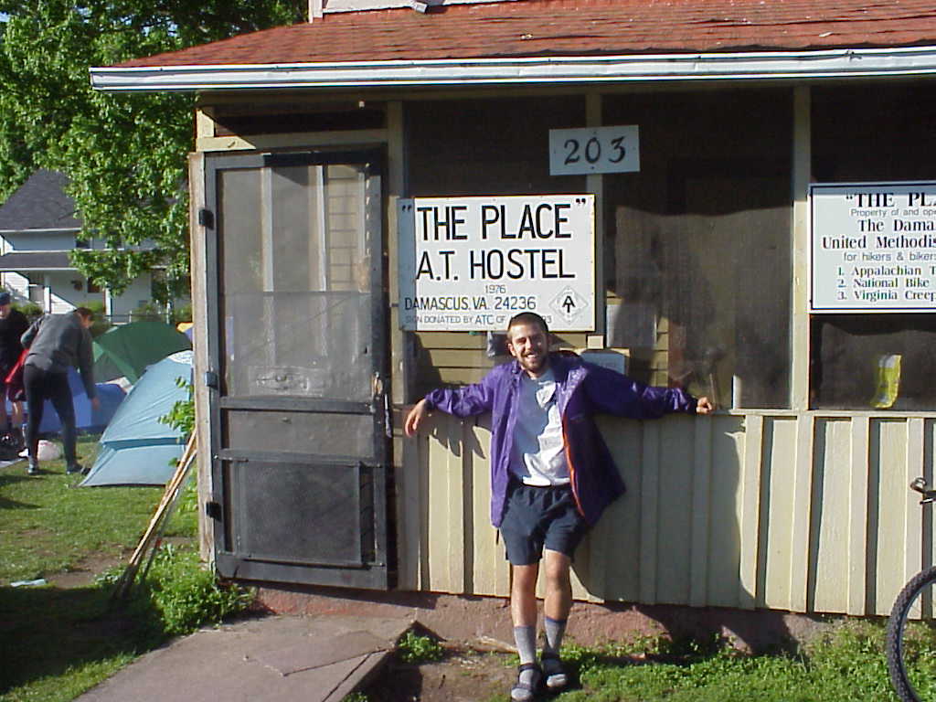 I made an unexpected but highly enjoyable and relaxing stop in Erwin, TN on May 6th. I split a motel room with three guys I met on the night before. here's the motley Crew in front of the deluxe room: John (aka "Medium Rare" which describes the tender condition of his feet), Blake, Ben, and John's pooch, Zoe. This night was the first time since I started the trail that I had a tv to watch. I fell asleep around 1AM to the sweet sounds of ESPN (5/7/99 9:01AM) |