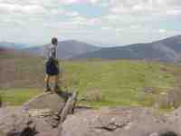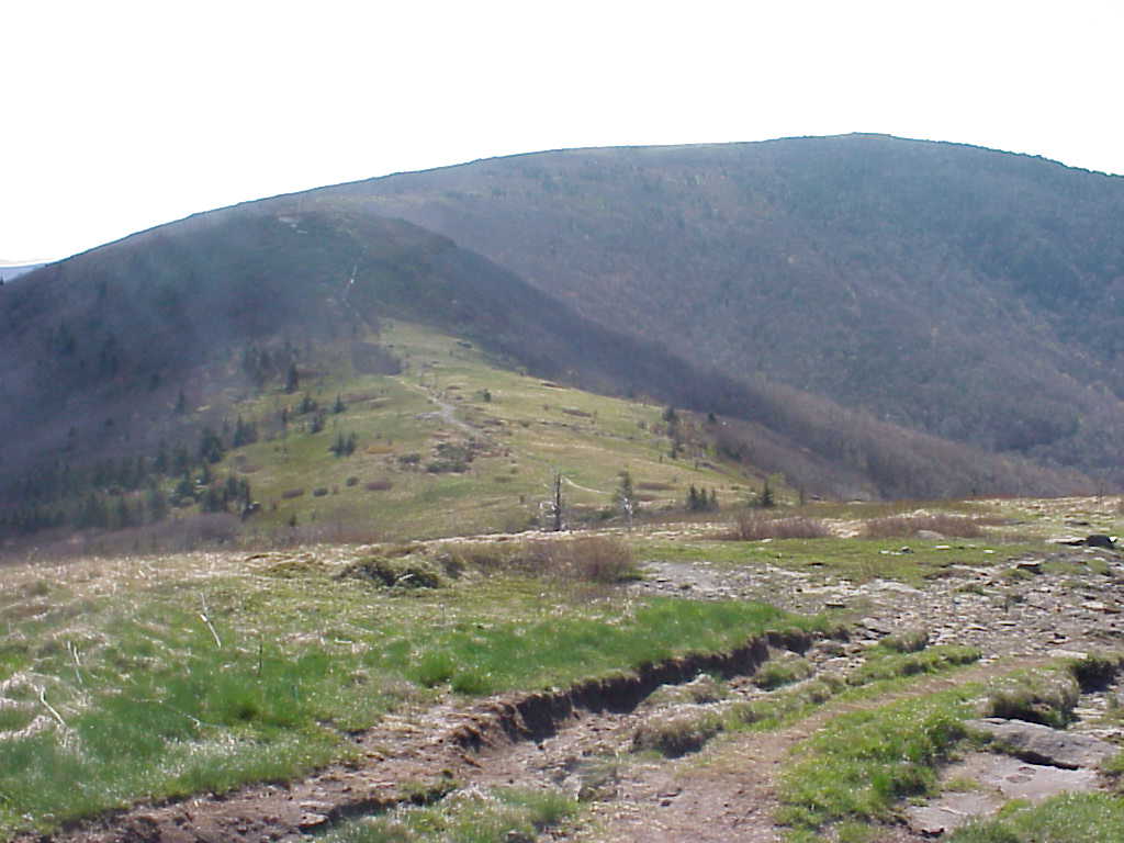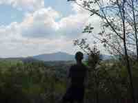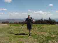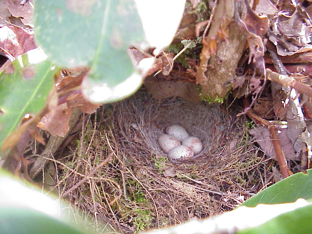 Juncos, small slate-colored birds (Reed remembers these from Mr. Millers class at WHS) have been my steady companion on the trail since day one. All through GA, NC, and TN they were frequently on the trail or in the trees around me. After nearly a month of searching, I finally found a junco nest on the right side of the trail. Each of these 4 eggs is about the size of a marble (5/7/99 1:51) |