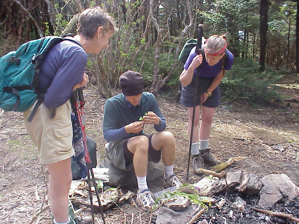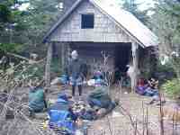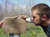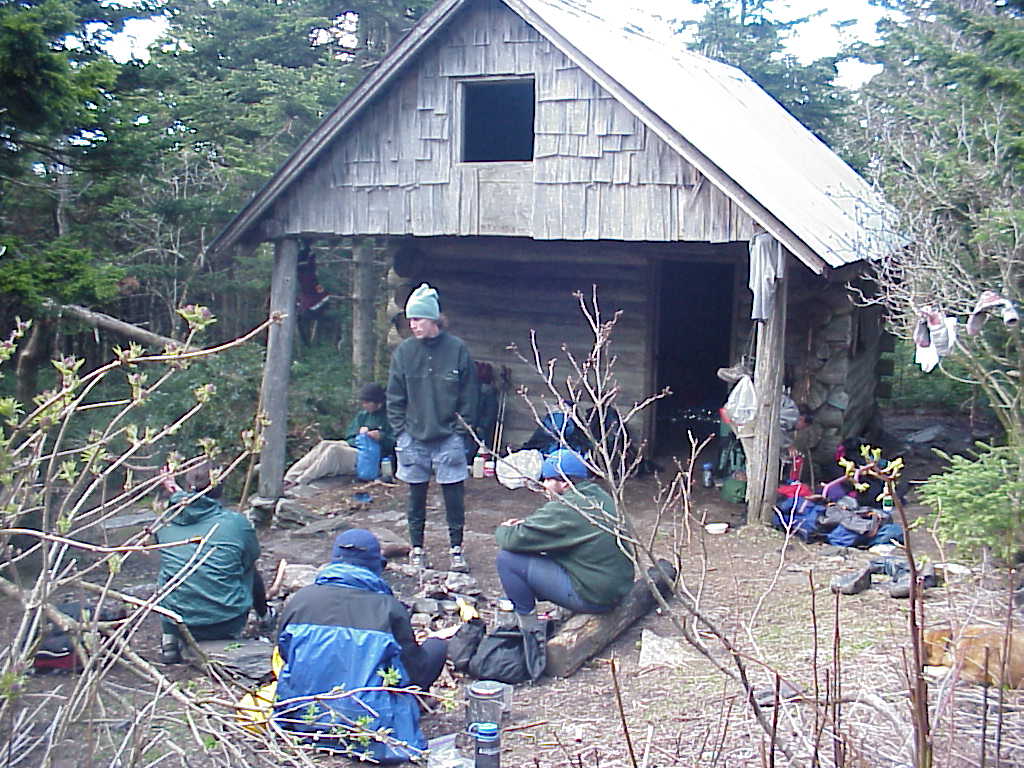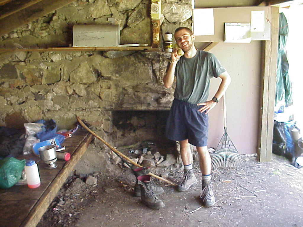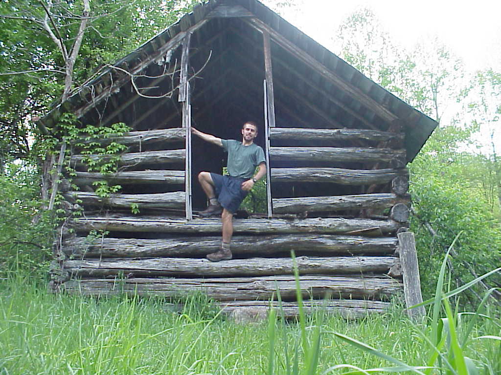 Most of the trail shelters are fairly barren, but some of the trail maintenance volunteers like to have a little fun by sprucing up the shelter. The Jerry's Cabin Shelter north of Hot Springs was equipped with both a telephone and light fixtures. unfortunately, with no electricity or phone lines, they are not very useful. Here, I unsuccessfully try to order pizza. (5/4/99 2:33pm) |