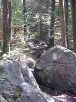 The Juncos nest was located on the edge of the trail, within the small rhododendron bush in the front, right section of this picture. (5/7/99 1:53) |